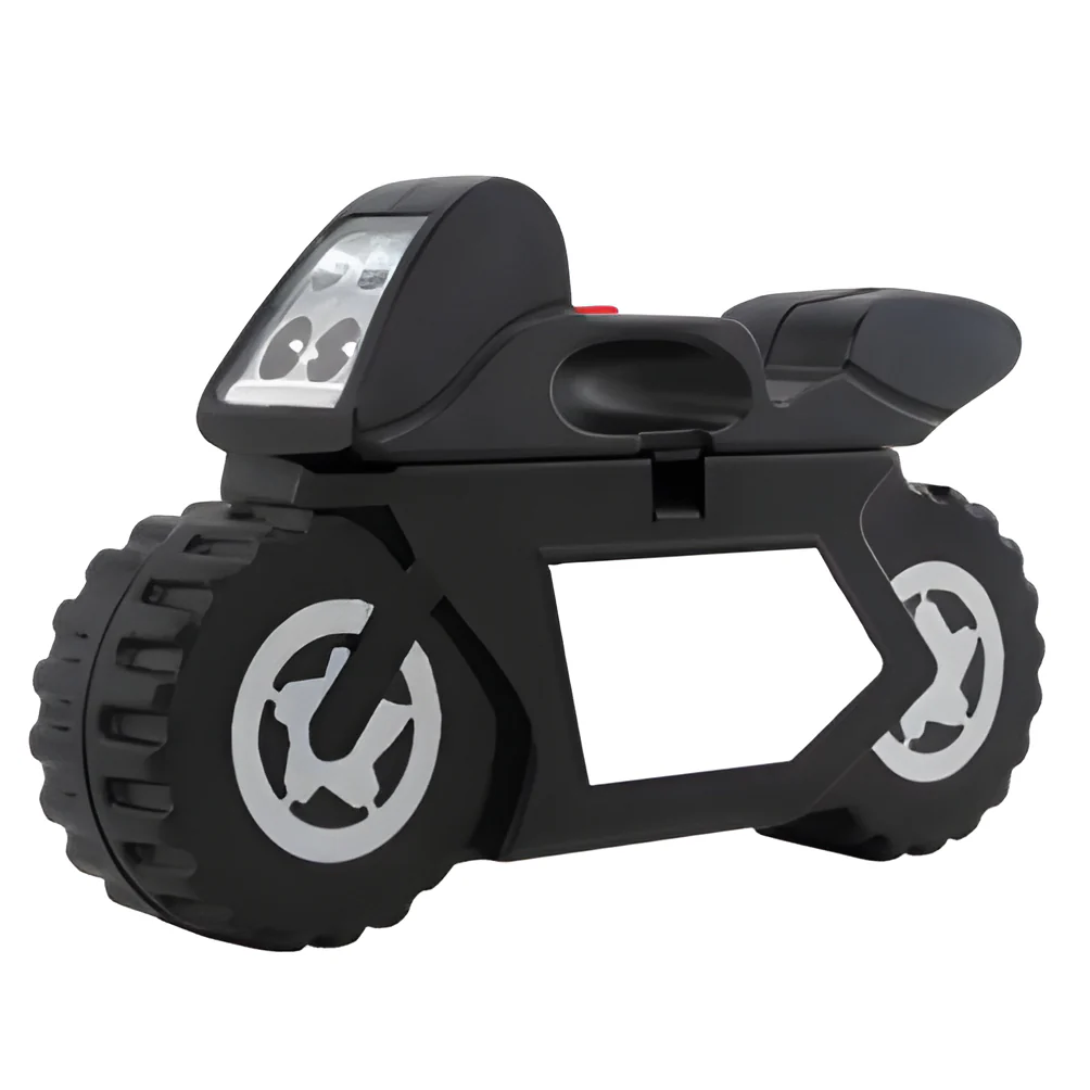 • Unique motorcycle shaped tool kit with printable metal insert