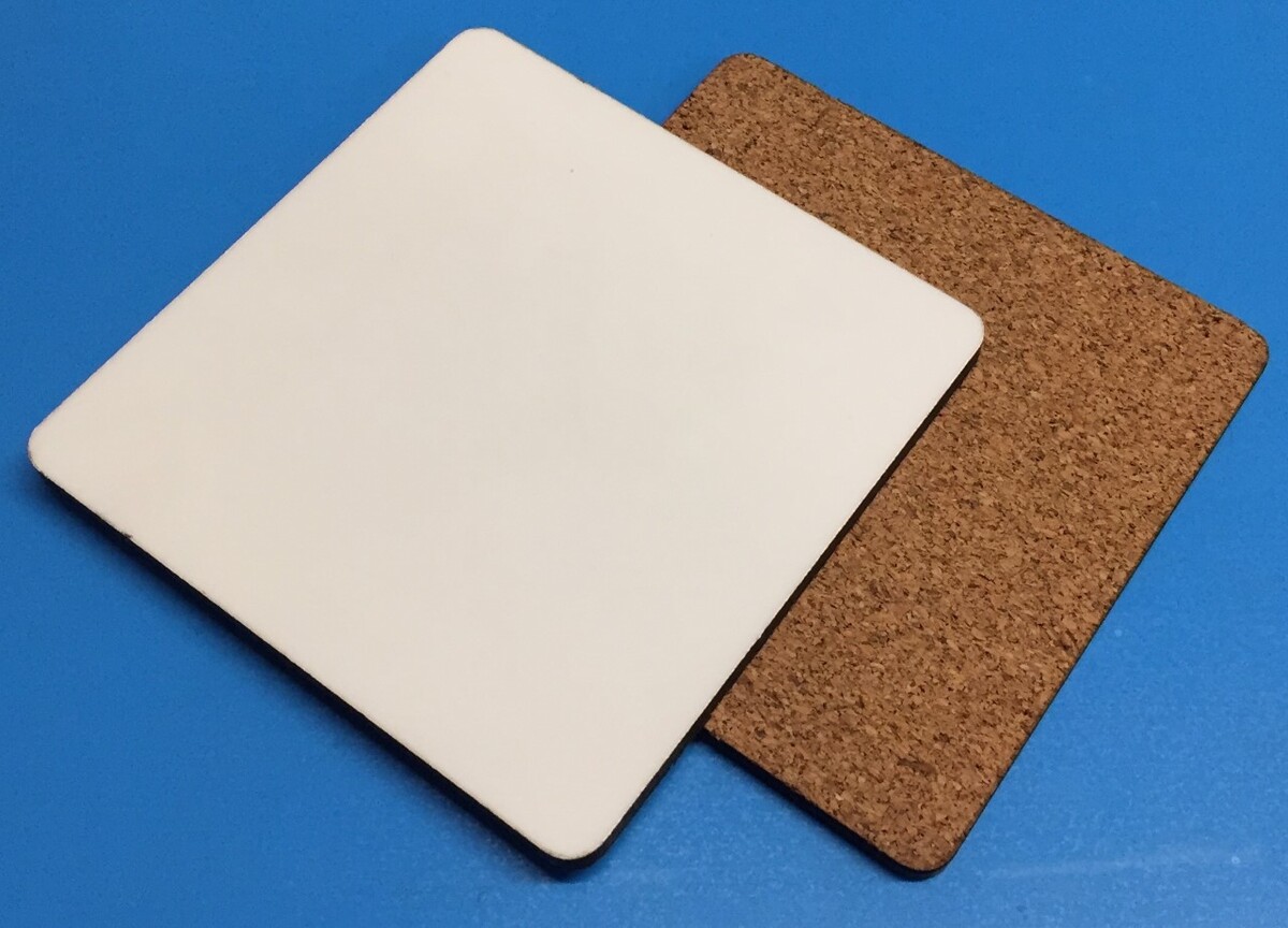 • White square MDF coasters with sublimation coating and cork non-slip base