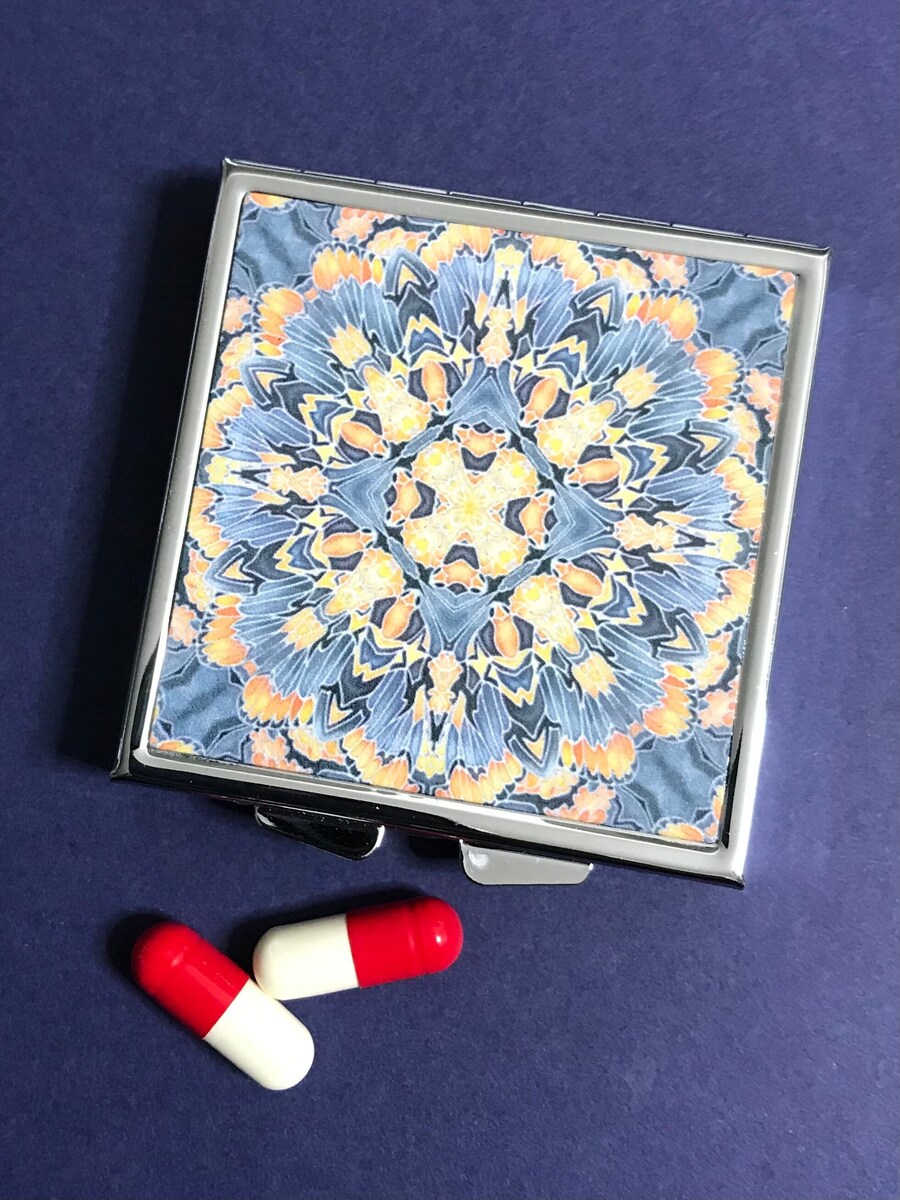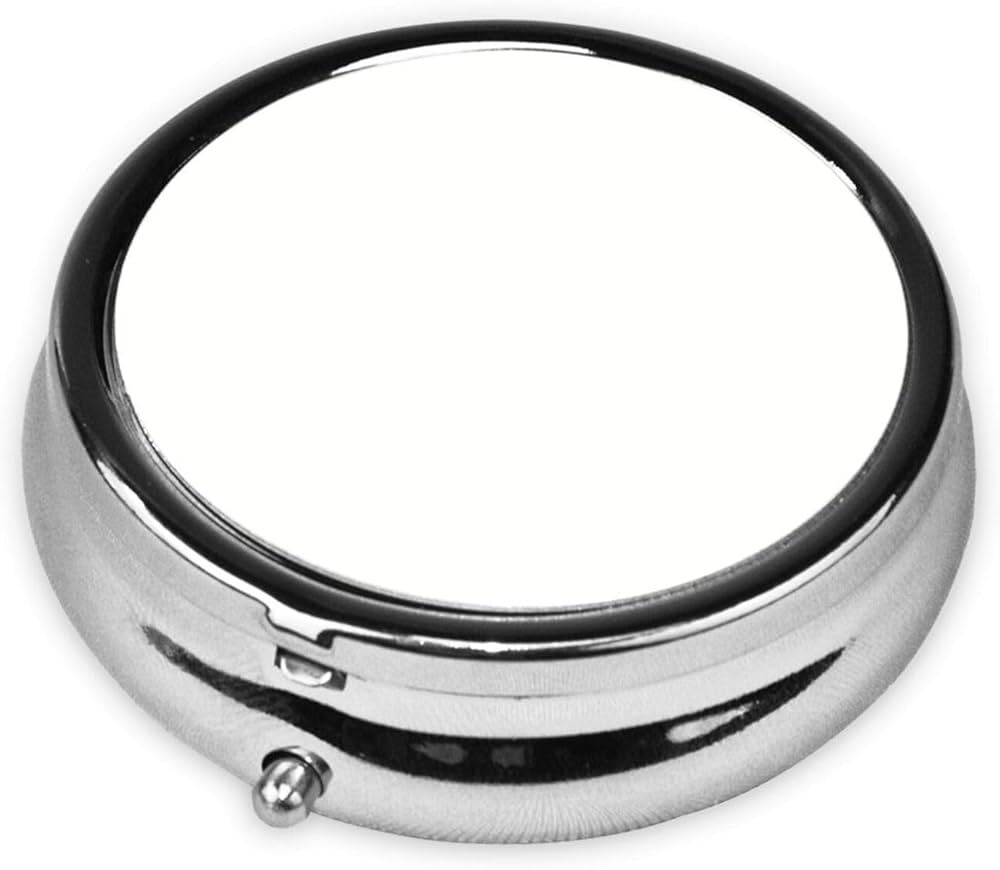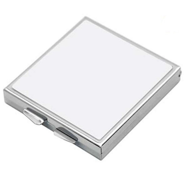 Stay organized in style with our sleek square pill box, crafted from high-quality metal with a durable plastic interior. This compact box features four separate compartments to keep pills, vitamins, or small items neatly stored. The inside lid includes a mirror for quick access, while the secure clasp ensures everything stays safely in place. The lid offers a 5.4cm x 5.4cm printable area, which can be customized with your choice of picture or design, adding a personal touch to this functional accessory. Measuring 6cm x 6cm, this pill box is perfect for travel or everyday use.