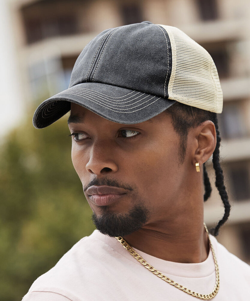 Mid-profile 6-panel design. Soft unstructured crown. Curved peak. Vintage styling. Contrast stitch colour. Snapback size adjuster. TearAway label for ease of rebranding. Contains recycled polyester.