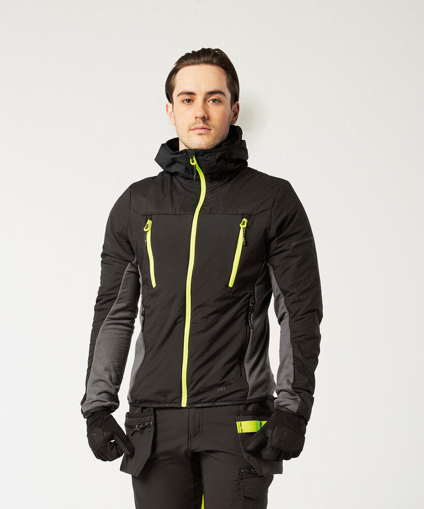 Titanmill ultra ripstop stretch: 90% Nylon, 10% Elastane ripstop. Extremely water-resistant, PFAS-free Texpel™ Splash Eco fabric finish – water beads away from the fabric surface. Acti-Reach™ innovative one-panel construction increases arm and torso mobility when reaching, turning or twisting. Insulatex™ Pro lining offers superior warmth without adding unnecessary weight. Innovative stretch panelling in key movement areas provides excellent comfort and flexibility. Four pockets offer ample storage. Zipped chest pockets. Side zip pockets. Pre-bent sleeves allow for increased freedom of movement. Hood for added protection against the elements. Body-mapped design helps balance insulation and increased freedom of movement. Elasticated cuffs for a secure fit. Reflective print for increased visibility and safety. Elasticated hem for a secure and comfortable fit. Chin guard for added comfort and stability. Easy-grip pulls attached to all zips.