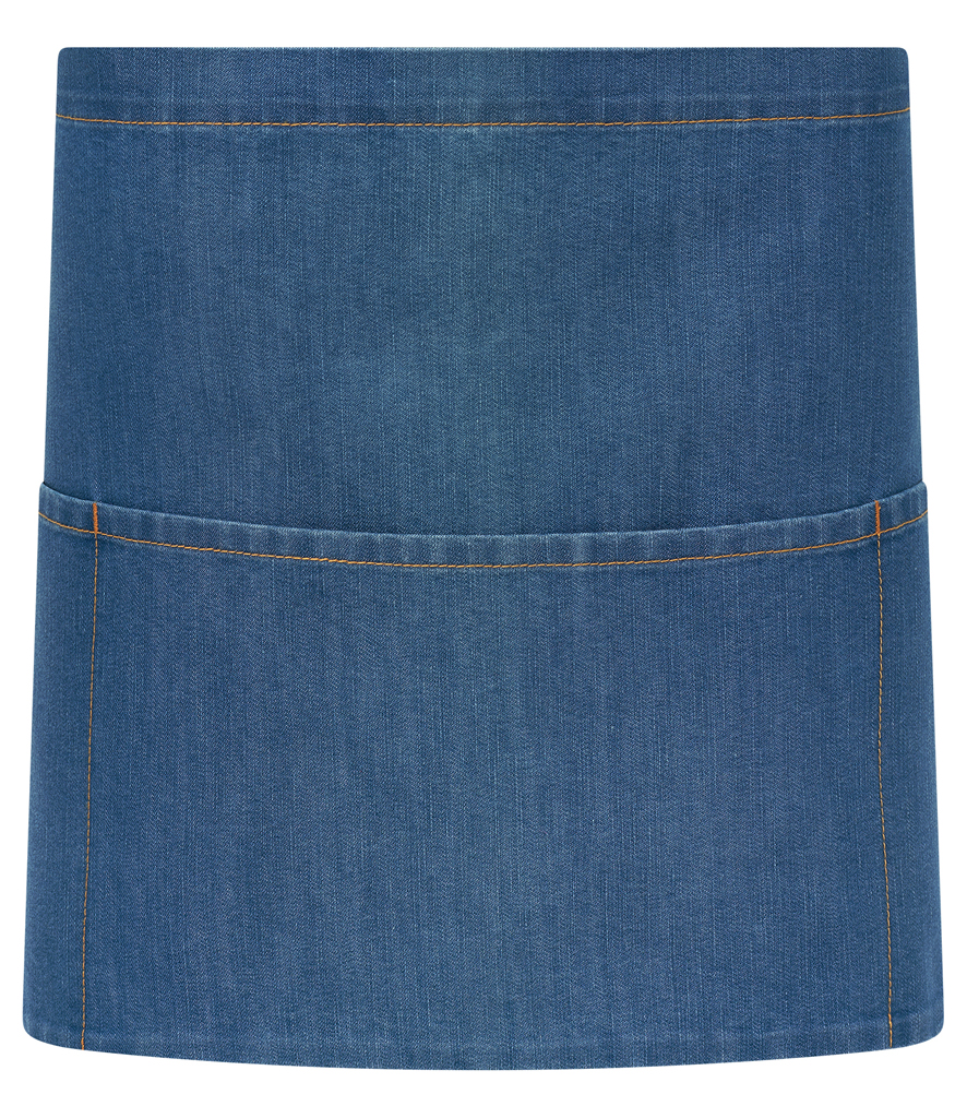 70% polyester/30% cotton. Easy care fabric. Three front pockets. Self fabric 95cm ties. Width 70cm. Length 36cm. Contrast stitching on blue denim and indigo denim. Wash 60°C. Tear out label.