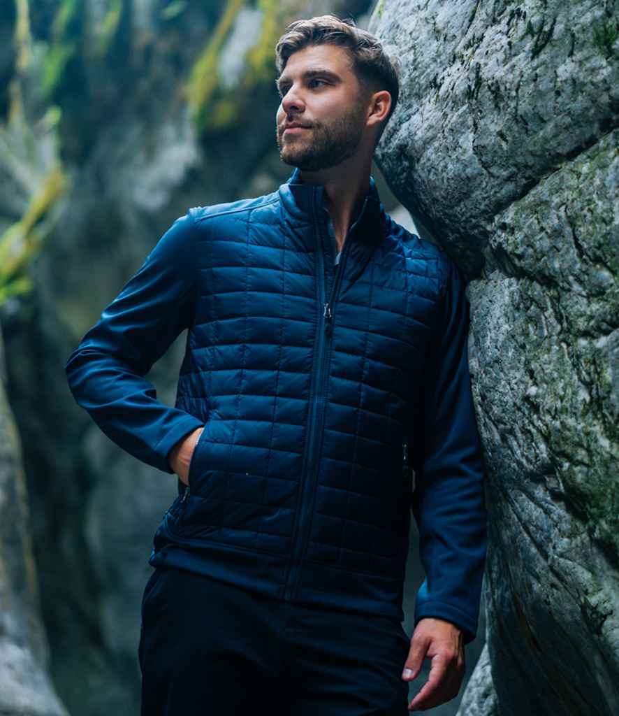 Two layer soft shell. 55% recycled polyester/45% polyester taffeta outer bonded with recycled polyester fleece. Four-way stretch fabric. 55% recycled polyester/45% polyester lining. Thermolex™ high loft synthetic down insulation. Lightweight. PFC-free DWR showerproof finish. High performance windproof outer shell. Full length zip with chin guard and brushed tricot inner zip guard. Articulated Elbows. Two front zip handwarmer pockets. Adjustable drawcord hem. Branded. Access for decoration.
