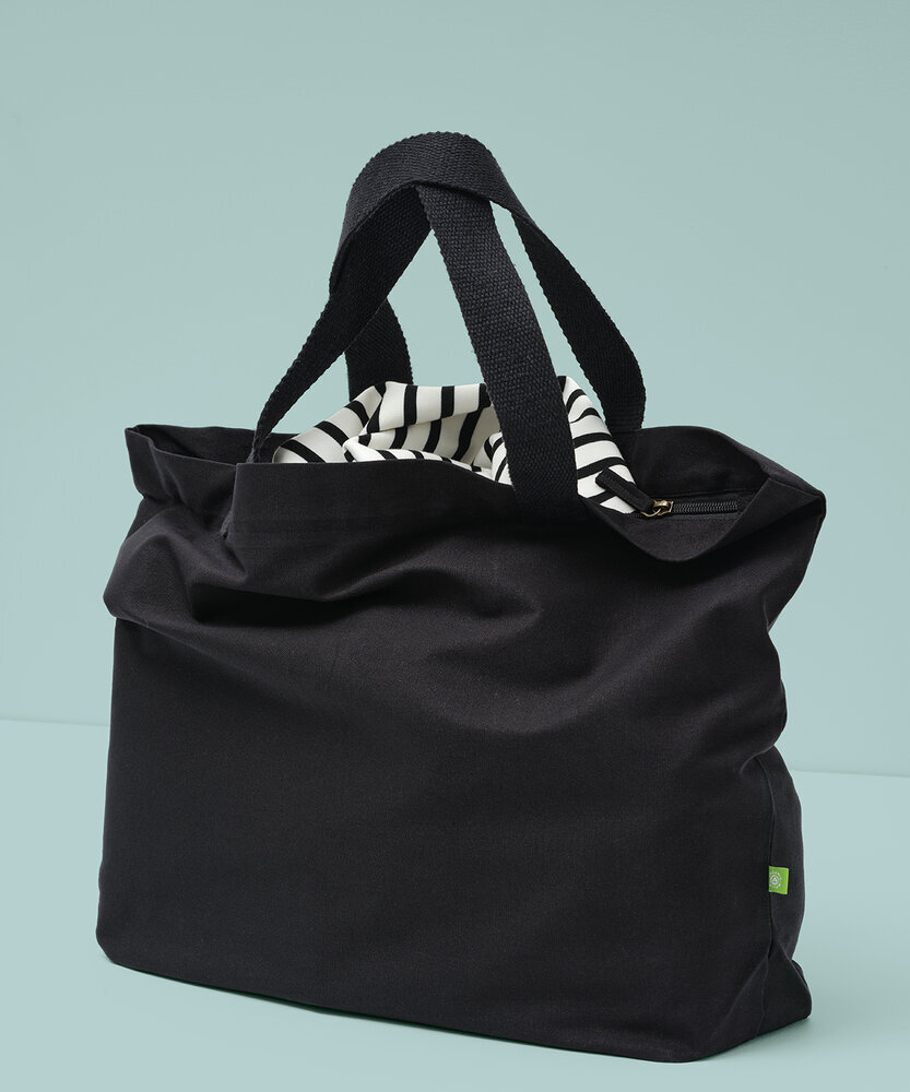 Tote. Zip closure. Internal pouch. Flat base. Durable webbing handle. Antique brass zip pull with cotton tab. Certified 340gsm organic cotton.