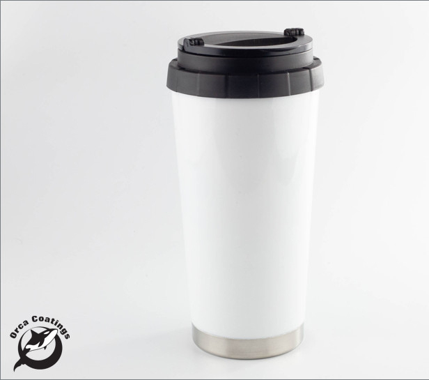 Stainless steel thermos with a white finish. Double walled and a leak proof cap.