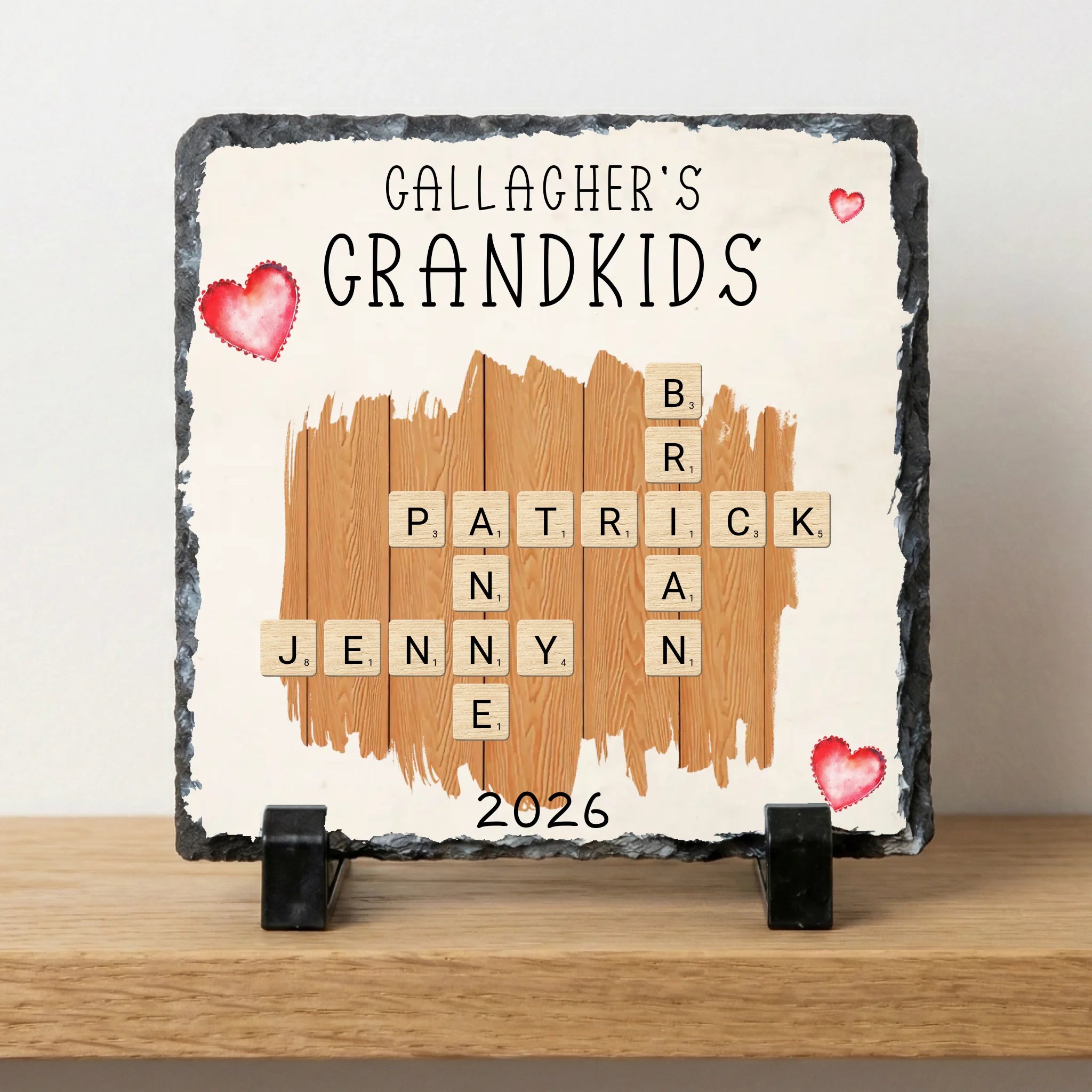 Display your favourite memories in a modern, stylish way with our personalised square photo slates. Made from natural slate stone, each piece features beautifully rustic edges, ensuring no two slates are ever the same. Your chosen photo is printed directly onto the slate in high-definition colour, creating a durable, long-lasting finish. Personalise with your family name and grandkids' names arranged in playful Scrabble letters for a charming, one-of-a-kind design. Each slate comes complete with a display stand, making it ready to showcase on shelves, desks, or mantelpieces. Available sizes: 14 × 14 cm 19 × 19 cm Key features: Natural slate with rustic cut edges High-quality, fade-resistant photo print Modern square shape Personalised with family and grandkids' names in Scrabble letters Includes display stand Each slate is naturally unique A timeless personalised keepsake — perfect for gifts, memorials, or stylish home décor displays.
