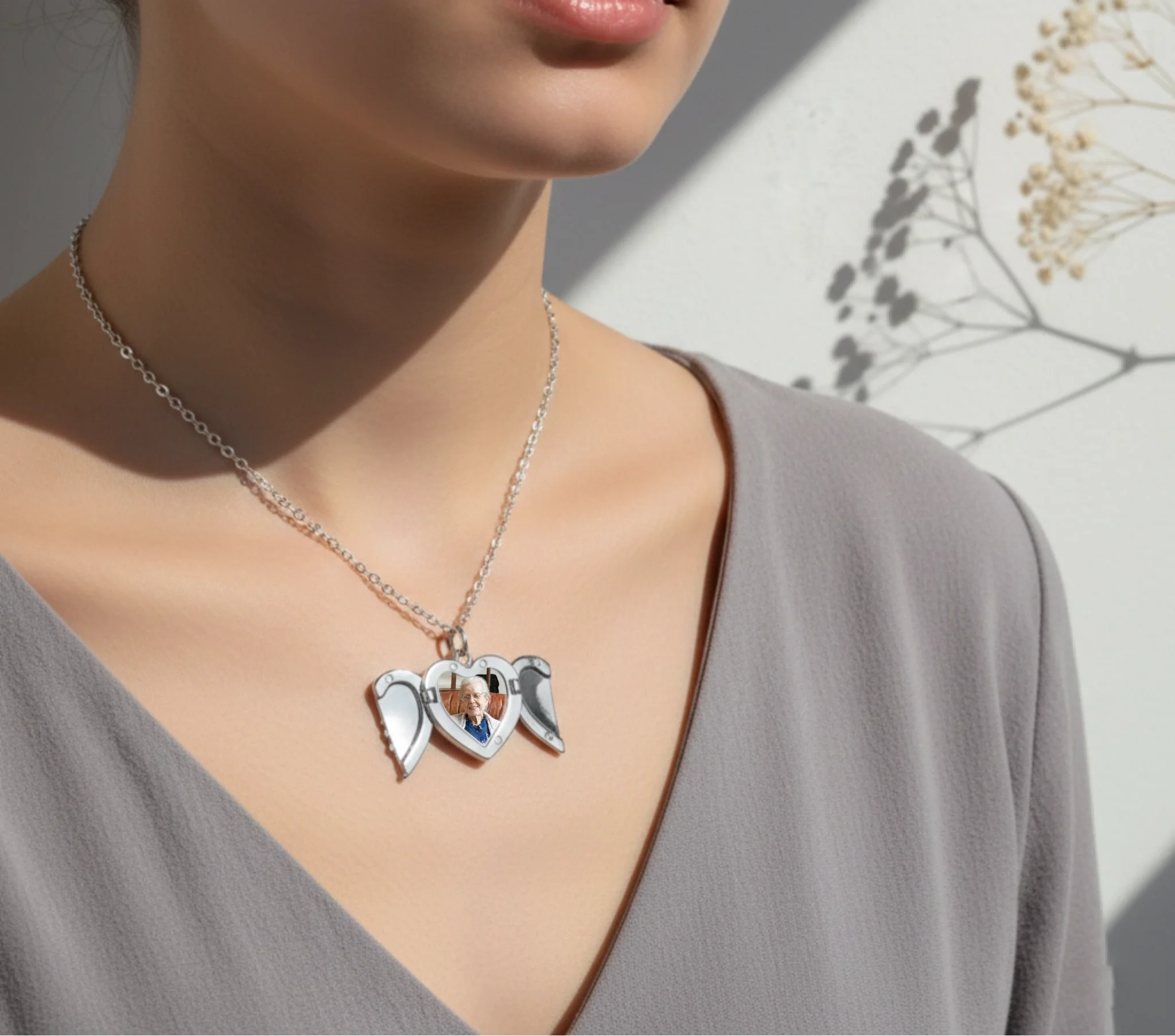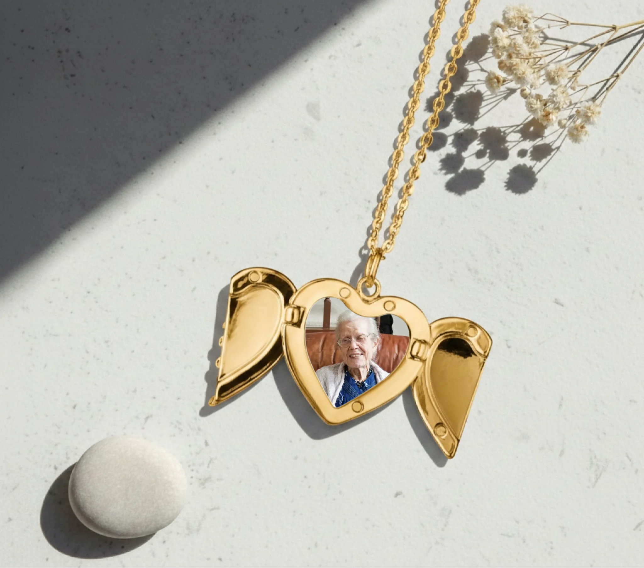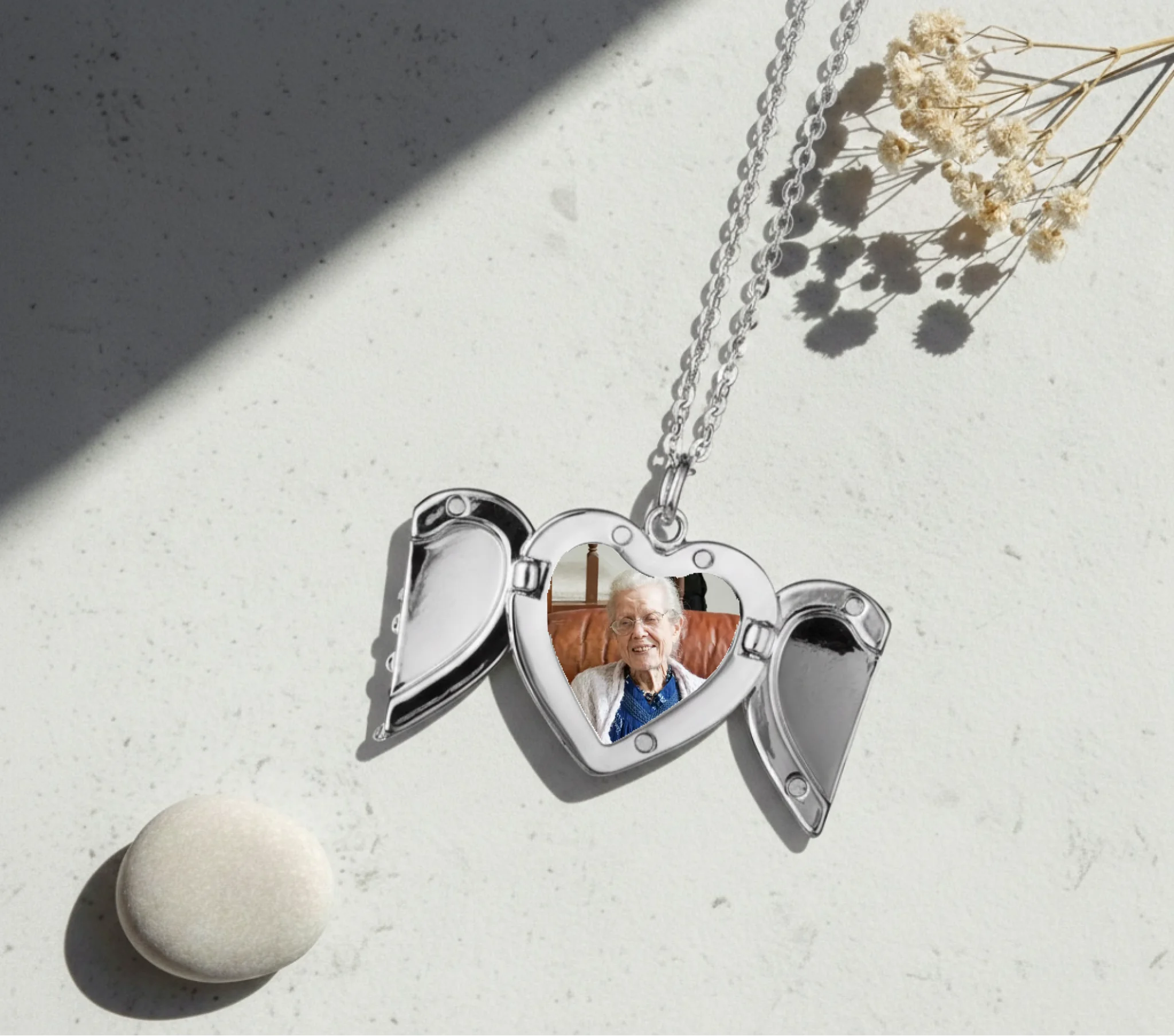 Our angel wing locket is a beautiful and meaningful piece of jewellery designed to hold a special memory close to your heart. The elegant angel wings open to reveal your personalised image inside, creating a deeply personal keepsake.